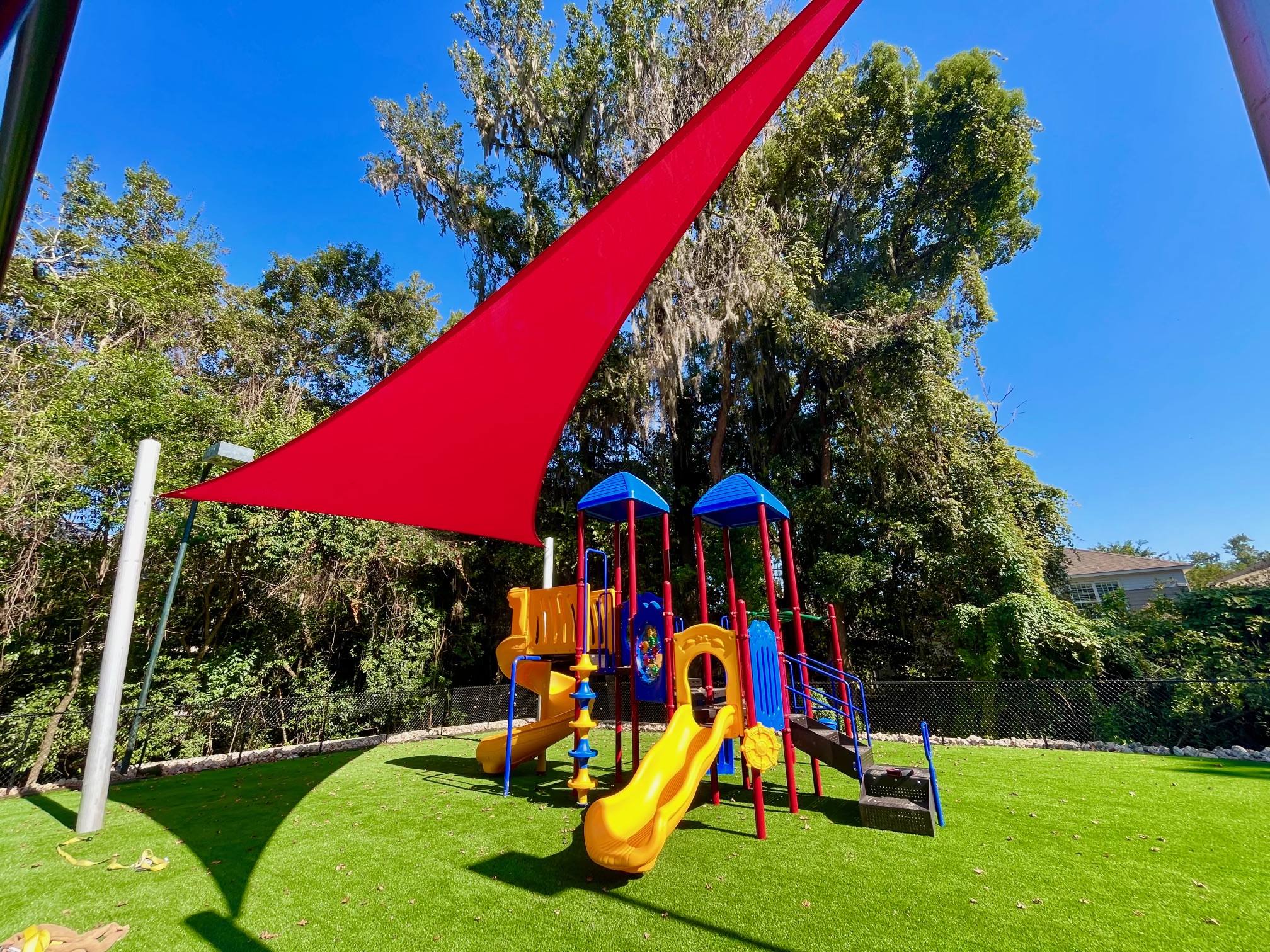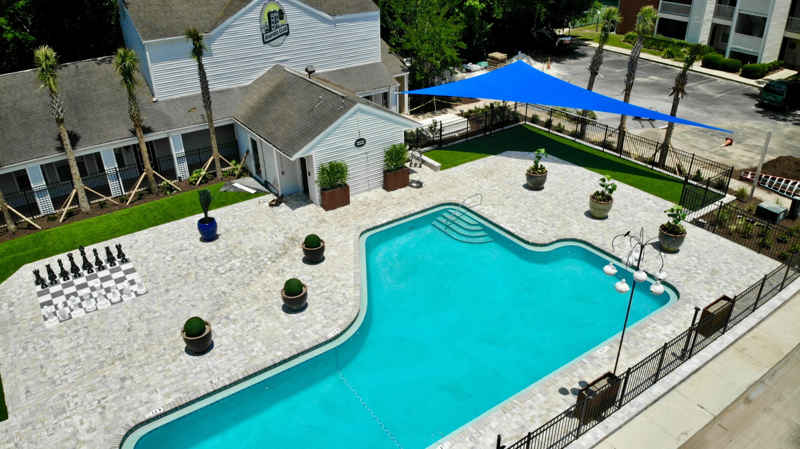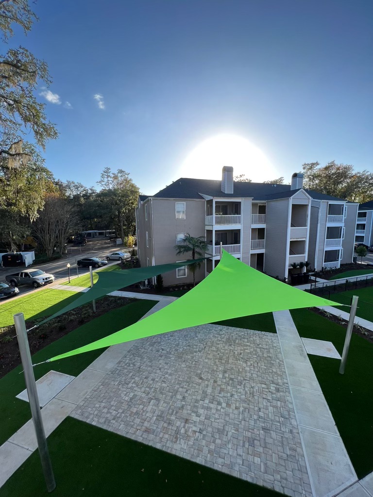 - Shade Structures: Shade sails were installed over the pool lounge, playground equipment, grill station, and the bocce ball seating area, offering sun protection for these recreational spaces.
