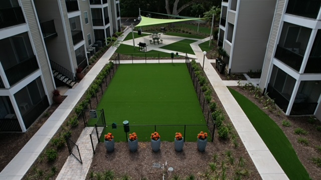 From the outset, we knew the project would require reimagining the signage, which was virtually nonexistent, and relocating the office to create a more welcoming and functional entryway. Separating the office from the pool deck was essential, as this was the main route for residents and potential residents. The non-functional spa needed to be removed, allowing space for larger decking with seating and shaded areas. Understanding the community’s long-term residents and their needs, we designed a pet spa to cater to their small pets and created areas for socializing and grilling. The outdated tennis court was addressed by incorporating a more versatile playground space for small children and families, while the addition of a bocce ball and pickleball court further enhanced recreational options. Existing structures, like the pergola at the far end of the complex, were in decline and required restoration. Additionally, the deep swales between buildings, likely created during the original construction, had become overgrown with undesirable trees. We needed to regrade these areas and introduce better landscaping. Finally, the owner’s desire to eliminate the need for regular lawn maintenance led us to integrate artificial turf and low-maintenance landscape elements throughout.